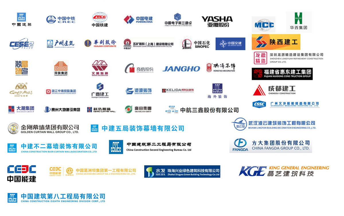 公司參建了諸多大型項(xiàng)目工程,如港珠澳大橋、珠海國(guó)際航展、深圳國(guó)際會(huì)展中心、廣州白云機(jī)場(chǎng)、西安全運(yùn)會(huì)場(chǎng)館、成都東安湖大運(yùn)會(huì)場(chǎng)館、樂(lè)山奧體中心、洛陽(yáng)奧體中心、增城富士康廠房、惠州中海油、陽(yáng)江核電站、珠三角各地鐵線、高鐵站、廣西桂林機(jī)場(chǎng)、廣西柳州文化廣場(chǎng)、四川成都天府機(jī)場(chǎng)、海南海口美蘭機(jī)場(chǎng)、西安絲路會(huì)展中心、惠州北站等等。與中國(guó)建筑、中國(guó)中鐵、中國(guó)鐵建、中國(guó)電建、中國(guó)交建、中國(guó)中冶、中國(guó)能建、廣東建筑、廣西建工、廣州建筑等大型國(guó)有企業(yè)下屬公司及江河幕墻、金螳螂裝飾等各大建筑裝飾、幕墻裝飾公司達(dá)成長(zhǎng)期友好合作關(guān)系。