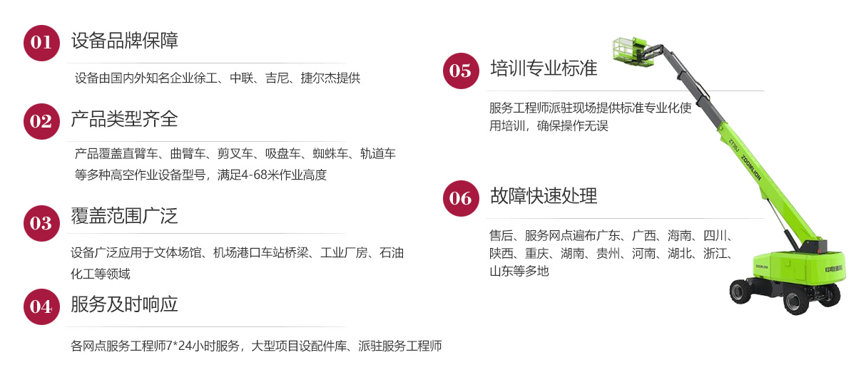 公司產(chǎn)品系列齊全,品種豐富,覆蓋了剪叉式、直臂式、曲臂式、蜘蛛式及吸盤(pán)式等多型號(hào)高空作業(yè)車(chē),滿足4至68米各種工作高度的施工要求。設(shè)備廣泛用于工程建設(shè)、文體場(chǎng)館、廠房搭建,施工維護(hù),幕墻裝飾、工程裝修、消防工程、市政工程、電力、通訊、高空管路鋪設(shè)、高架橋梁的建造、涂裝及各種大型工礦企業(yè)等場(chǎng)所。設(shè)備移動(dòng)靈活,安全穩(wěn)定,能有效提高施工效率,降低工人勞動(dòng)強(qiáng)度,縮短施工時(shí)間,節(jié)省施工成本,是高效安全施工的理想選擇。